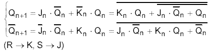 combinaţiei R = S = 1 se poate modifica schema circuitului astfel încât el să aibă o evoluţie cunoscută şi după o astfel de comandă, adică: R = S = 1 -› Qn+1= Qn. Matricea de excitaţie şi configuraţia obţinută prin sinteză sunt prezentate în figura 2.23, iar ecuaţiile de funcţionare corespunzătoare sunt arătate mai jos.