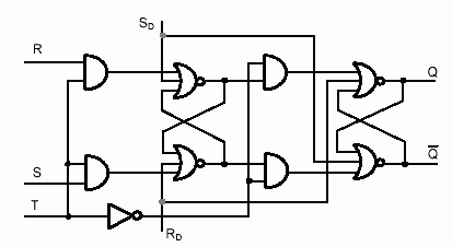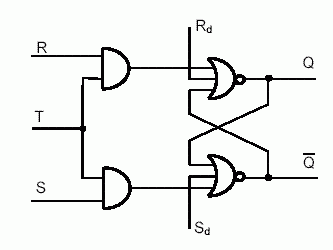 Realizarea practică a comutării simultane a semnalelor de intrare este imposibilă, ceea ce determină apariţia unei ambiguităţii a stării bistabilului după comutare. Din acest motiv se introduce noţiunea de sincronizare, folosind pentru aceasta o intrare de ceas (T) (figura 2.18).