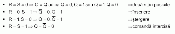 Pentru ultima caz (R = S = 1) circuitul pierde caracteristica de circuit cu două stări. În plus, la anularea acestei comenzi (R = S = 0) apare o ambiguitate asupra stării în care va rămâne circuitul deoarece practic este imposibilă comutarea simultană a celor două porţi. Se va trece deci sau prin R = 0, S = 1 ( ® Q = 1) sau prin R = 1, S = 0 (® Q = 0). Din aceste motive, comanda R = S = 1 nu este permisă.