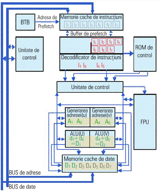 Imaginea de mai jos reprezinta arhitectura unui procesor modern, in care sunt evidentiate cele doua canale U si V, pe care se prelucreaza, in paralel, instructiunile.