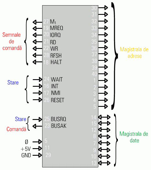 Z80 este un microprocesor pe 8 biti, cu 16 linii de adresa. Semnalele externe, prin care microprocesorul comunica cu lumea externa, pot fi grupate functional în trei mari clase de semnale: